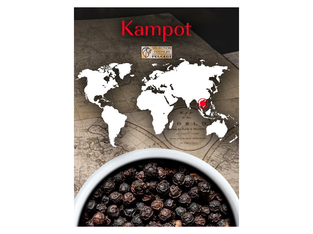 Kampotské bio čierne korenie Peugeot pochádzajúce z provincie Kampot v Kambodži má ovocnú chuť s nádychom mäty, balené v troch vzduchotesných vreckách po 20 g pre maximálnu čerstvosť.