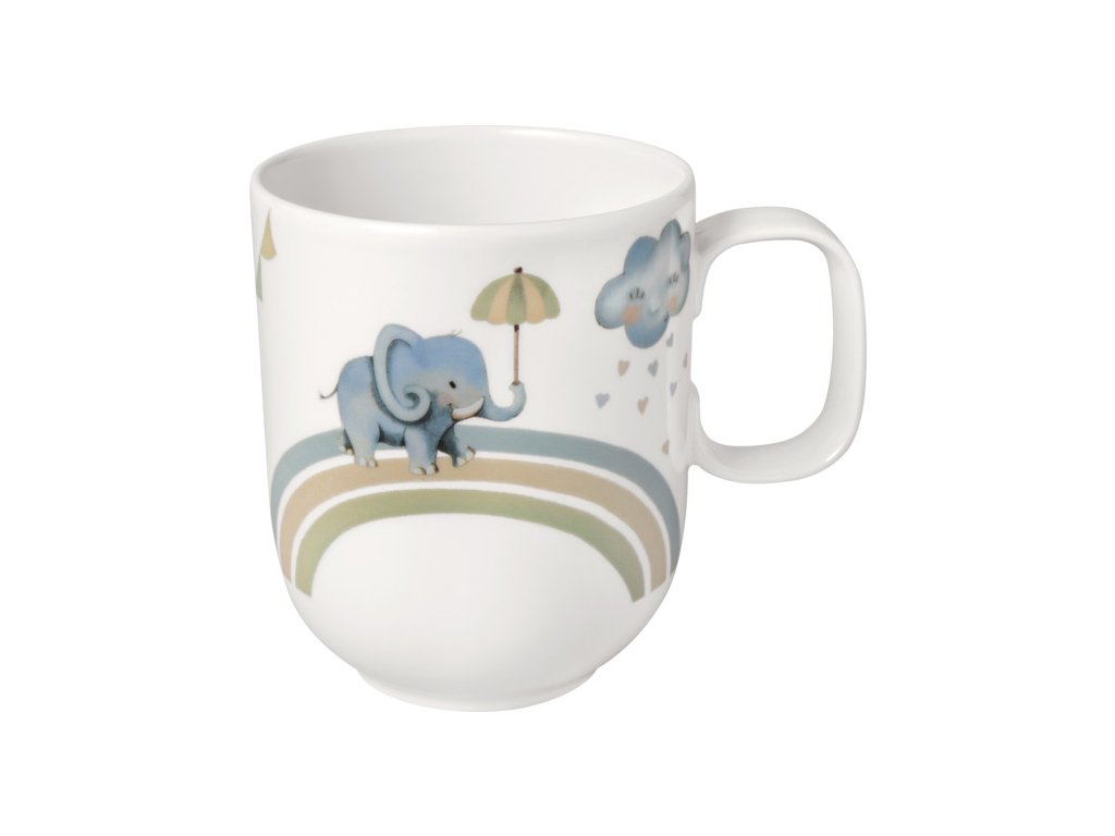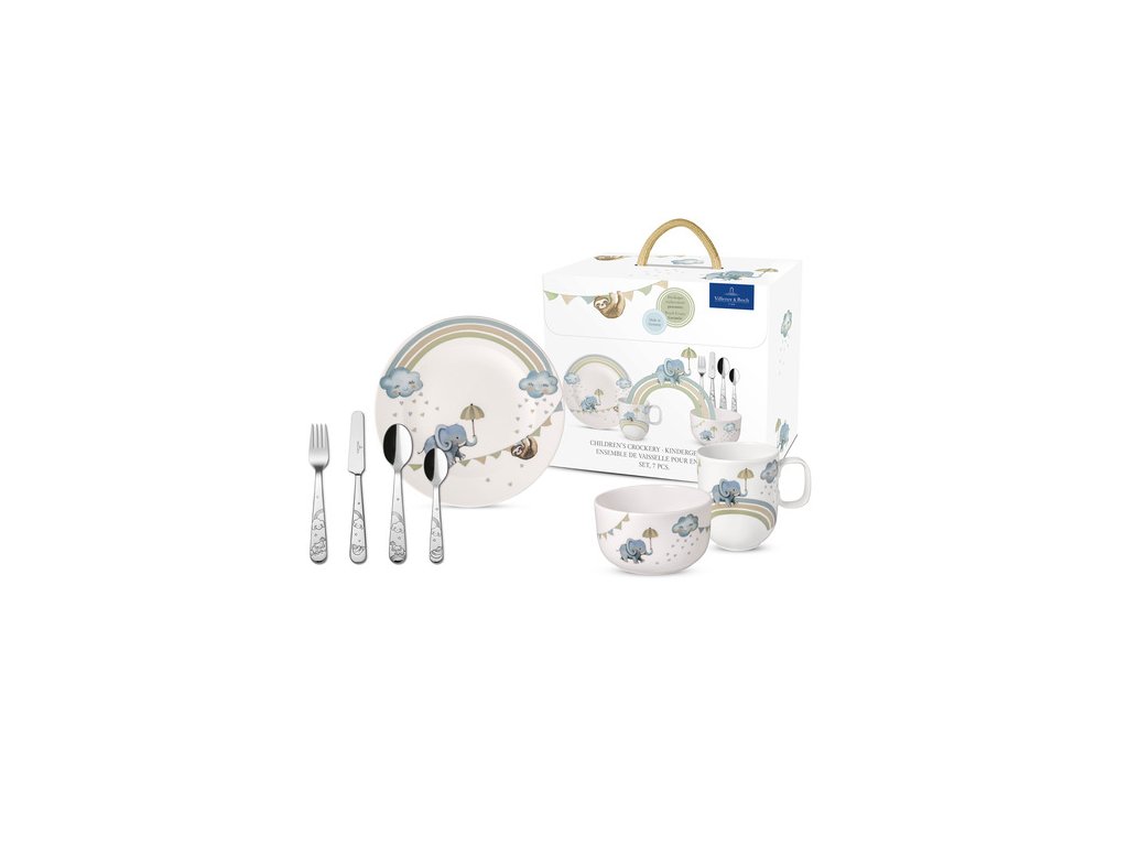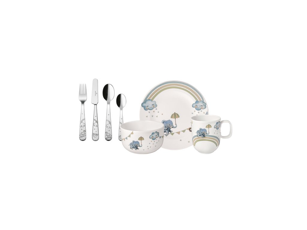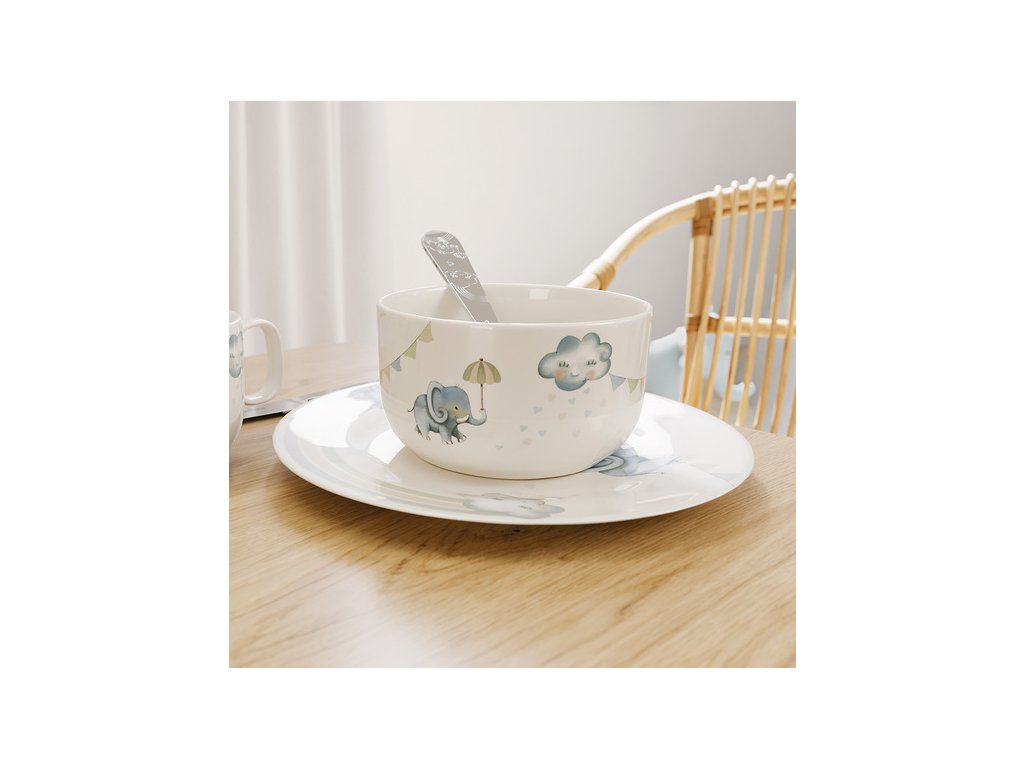 Detská jedálenská súprava (tanier, miska a hrnček) s detským príborom z prémiového porcelánu z kolekcie Walk like an Elephant od nemeckého výrobcu Villeroy & Boch.