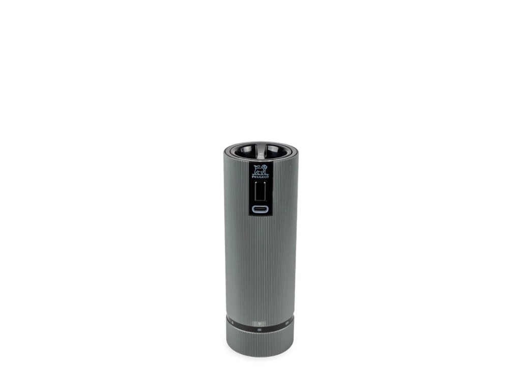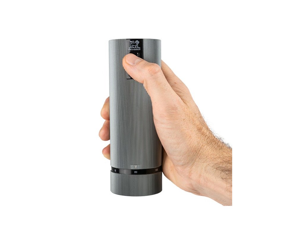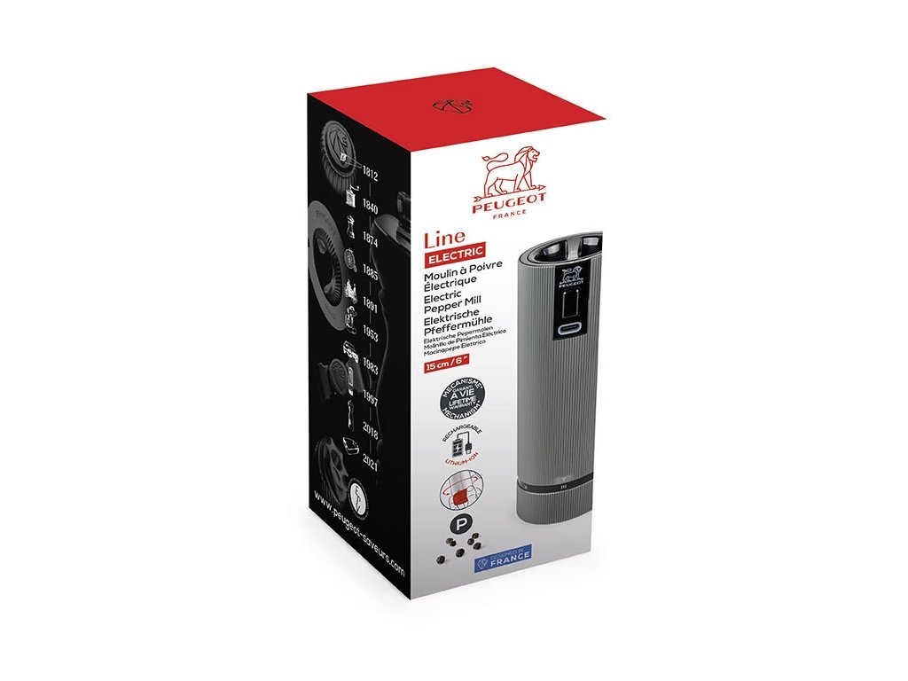 Elektrický mlynček na korenie z kolekcie Line Electric spája moderný dizajn, technologickú inovatívnosť a praktickú funkčnosť. Kompaktný mlynček má vrúbkovaný povrch a je vyrobený z prémiových materiálov. Srdcom mlynčeka je mechanizmus Zirlion, revolučná technológia z vývojového oddelenia spoločnosti Peugeot, vďaka ktorej vám pôjde mletie od ruky. Elektrické mlynčeky Line Electric sú vybavené systémom uSelect, ktorý umožňuje výber až zo šiestich prednastavených hrubostí mletia od jemného prášku až po veľké kusy soli. Mlynček je vhodný na mletie čierneho, bieleho, zeleného, červeného korenia a ružového korenia (max. 15% v zmesi). Môžete ho využiť aj na mletie koriandra.