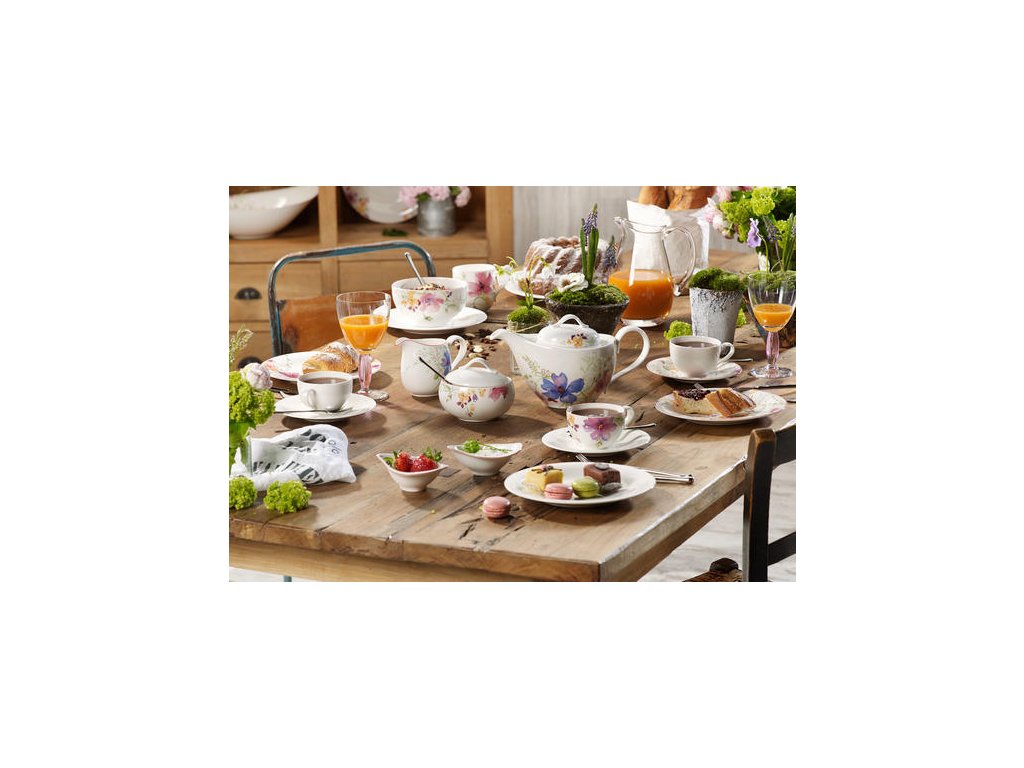 Hrejivé slnečné lúče dotýkajúce sa vašej tváre sprevádzané vôňou rozmanitých kvetov, ktoré sa jemne nákláňajú smerom k vám v ľahkom vánku - to je hravá a romantická kolekcia Mariefleur. Vzor zachytáva radostnú atmosféru vidieckej letnej záhrady a prináša ho priamo na váš stôl. Významný francúzsky maliar Claude Monet bol známy cyklami Lekná, ale stále sa snažil o rôzne tóny farebnosti kvetov a zachytiť ich prirodzenú krásu vo svojej veľkej záhrade v Giverny. Kolekcia Mariefleur vám tiež umožňuje vytvoriť kombinácie, ktoré spolu nádherne ladia. Rozdielne motívy vyzerajú, že vyrastajú mimo porcelánu.