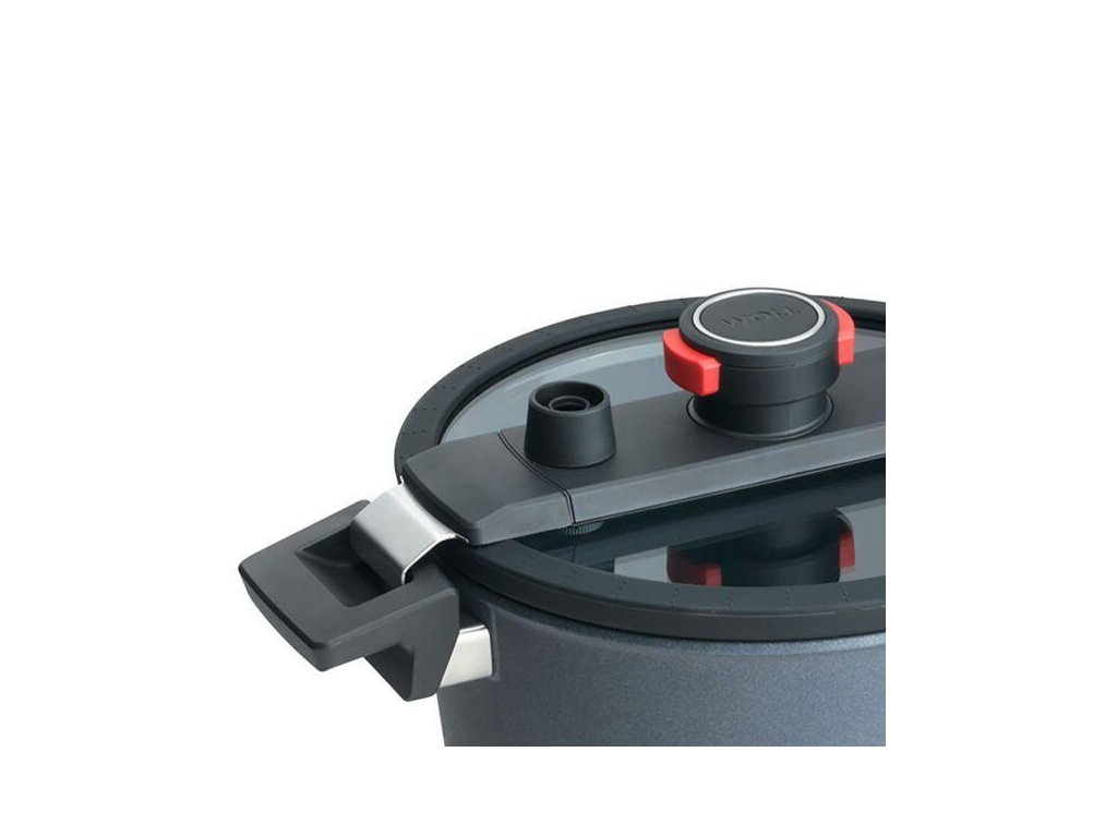 V roku 1974 začal Norbert Woll podnikať a odvtedy je nemecký špecializovaný výrobca Woll synonymom pre kvalitný riad z hliníkových zliatin, ktorý je zastúpený vo viac ako 45 krajinách po celom svete. Telo hrnca je vyrobené z hliníkovej zliatiny, ktorá obsahuje päť vrstiev nepriľnavého povrchu a je tvrdená pomocou syntetického diamantu, vďaka čomu je hrniec odolný voči poškriabaniu. S novou technológiou spracovania indukčného plátu po celom povrchu dna hrnca dochádza k rýchlemu a rovnomernému zahriatiu povrchu hrnca. Rukoväte hrnca sú vyrobené z odolného materiálu a hrniec je možné bez pokrievky používať v klasickej rúre až do teploty 250 °C. Unikátna pokrievka je vyrobená z bezpečnostného tvrdeného skla a umožní vám varenie pri nízkom tlaku alebo varenie v pare. Silikónové tesnenie zabráni unikaniu vzduchu. Patentovaný mechanizmus pokrievky vám ju umožní intuitívne zamykať len pomocou jednej ruky. Súčasťou pokrievky je odvzdušňovací ventil so silikónovým krytom pre vyrovnanie konštantného tlaku. Pri príprave vášho obľúbeného pokrmu skrátite čas varenia a rovnako ušetríte aj za energie. Ak chcete počas varenia pridať ingrediencie, nemusíte skrz ventil vypúšťať paru, pretože všetko za vás obstará intuitívny systém stlačenia jednou rukou.