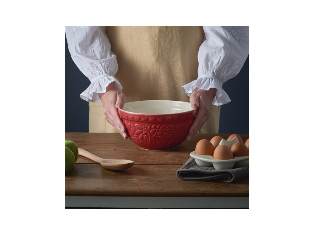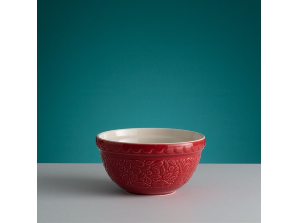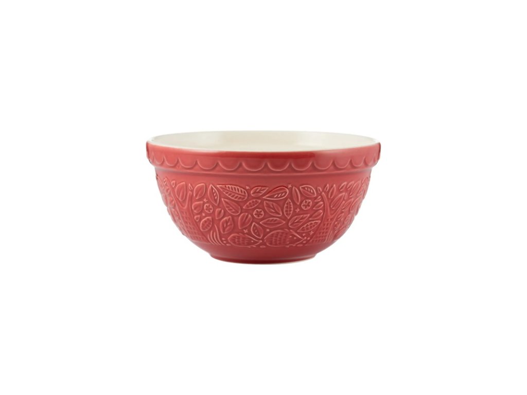 Červená kameninová misa 21 cm z kolekcie In The Forest od anglického výrobcu Mason Cash s reliéfom ježka, objem 1,1 l, ideálna na miešanie cesta. Vhodná do umývačky, mikrovlnky aj mrazničky.