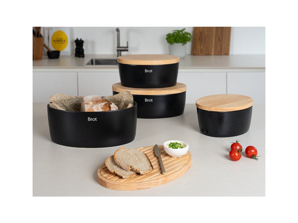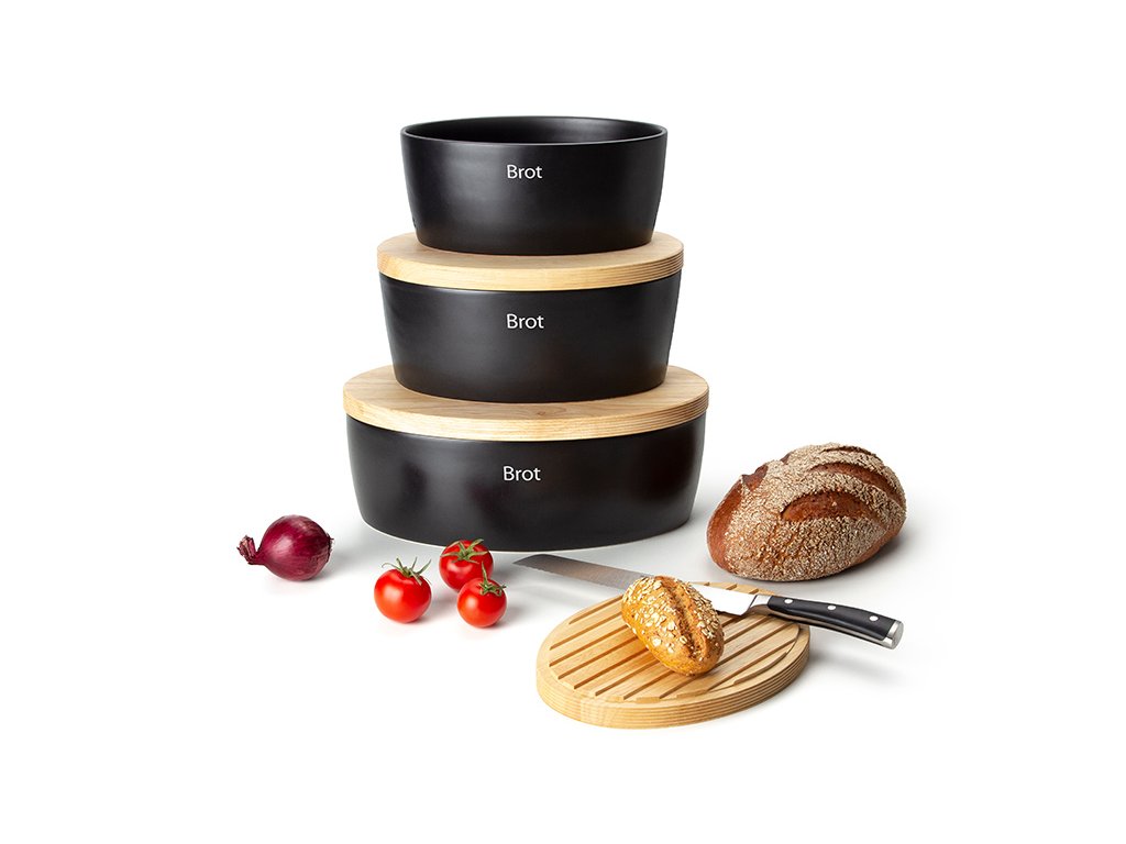 Keramický chlebník v čiernej farbe s dreveným uzáverom/doskou na krájanie od nemeckého výrobcu Continenta.