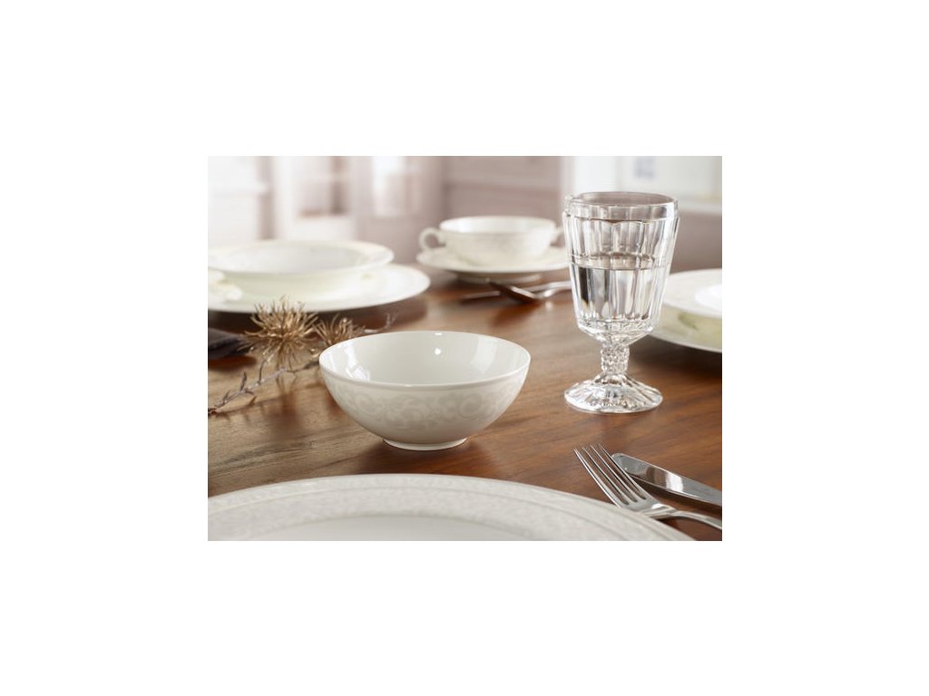 Kolekcia Gray Pearl je vyrobená z bieleho kostného porcelánu s jemným vzorom, ktorý podčiarkuje jej elegantný charakter. Klasické tvary s drobným plastickým vzorom v jemnom sivo-striebornom odtieni dodávajú porcelánu nádych exkluzivity a luxusu. Vhodné na slávnostné večere.
