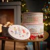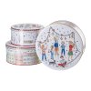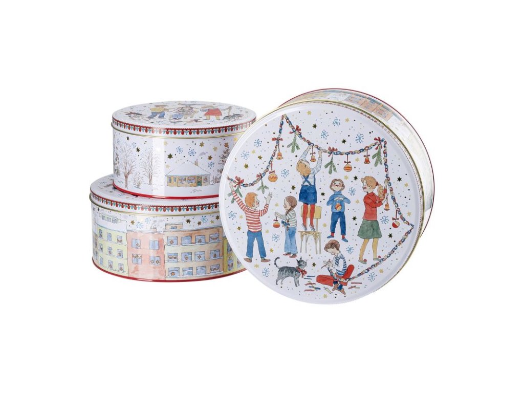 Okrúhle kovové dózy na medovníky z výročnej kolekcie 2024 Weihnachtsleuchten s ilustráciami od Renáty Fučíkovej od nemeckého výrobcu Hutschenreuther.