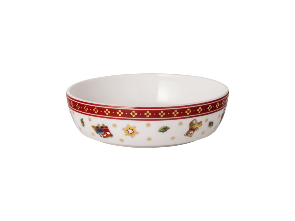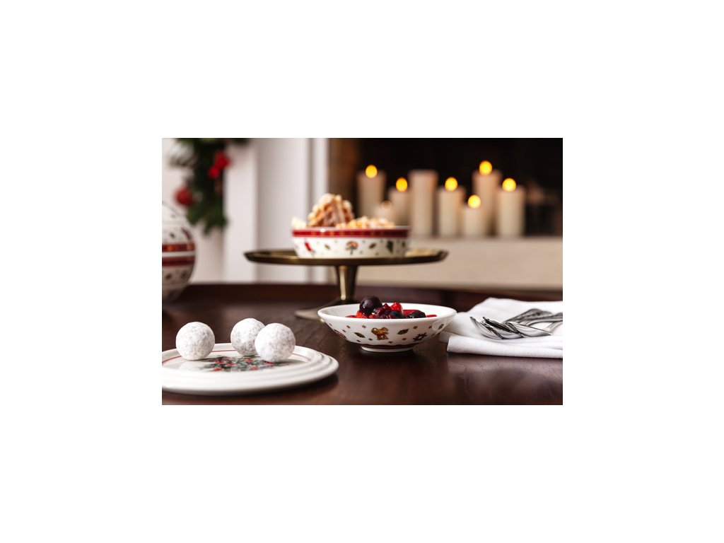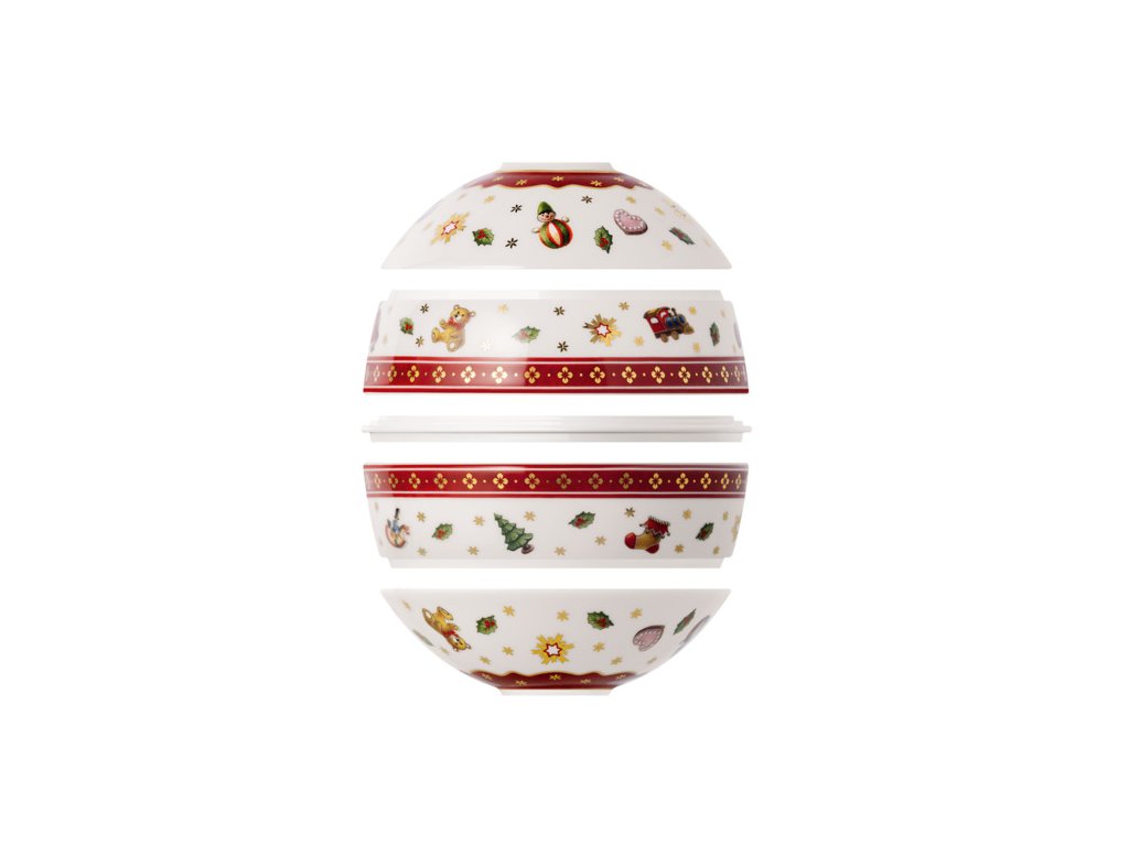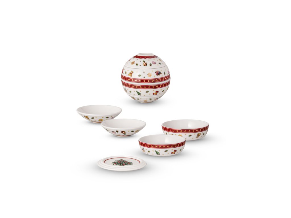 Servis na predjedlo alebo malé občerstvenie La petite Boule (obsahuje 2 x miska, 2 x plochá miska a 1 x servírovací tanier) z prémiového porcelánu z najobľúbenejšej vianočnej kolekcie Toy's Delight od nemeckého výrobcu Villeroy & Boch.