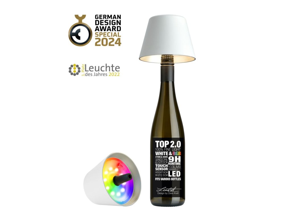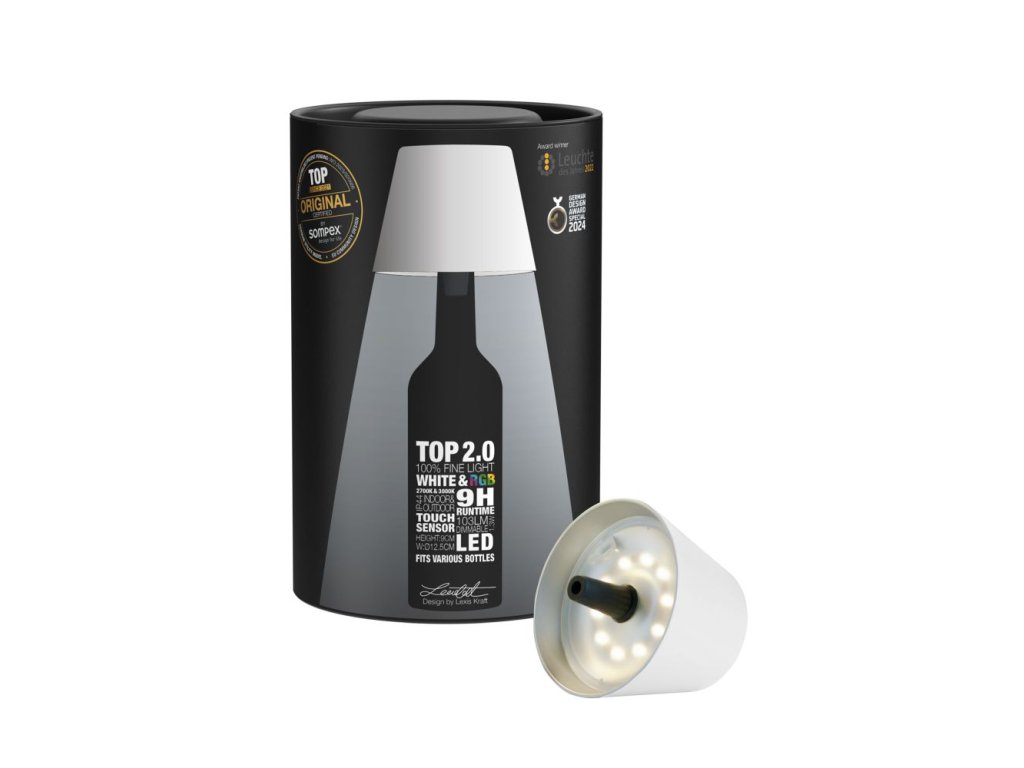 Stmievateľná lampička do fľaše na batériu Top 2.0 vo farbe: biela s priloženou nabíjacou stanicou od nemeckého výrobcu Sompex.