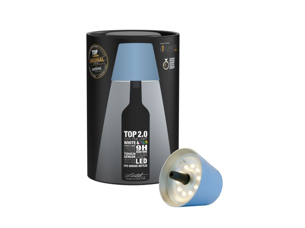 Dostupná v rôznych farebných variantoch a zabalená v elegantnom okrúhlom balení pripomínajúcom luxusné fľaše – ideálne pre každého milovníka dizajnových a originálnych darčekov. Dotyková lampa TOP 2.0 od Sompex vás očarí nielen svojím dizajnom, ale aj inteligentnými svetelnými režimami. Pomocou dotykového senzora ukrytého v plastovom tienidle si vyberiete medzi tromi rôznymi svetelnými režimami, ktoré vytvoria dokonalú atmosféru – doma aj vonku.