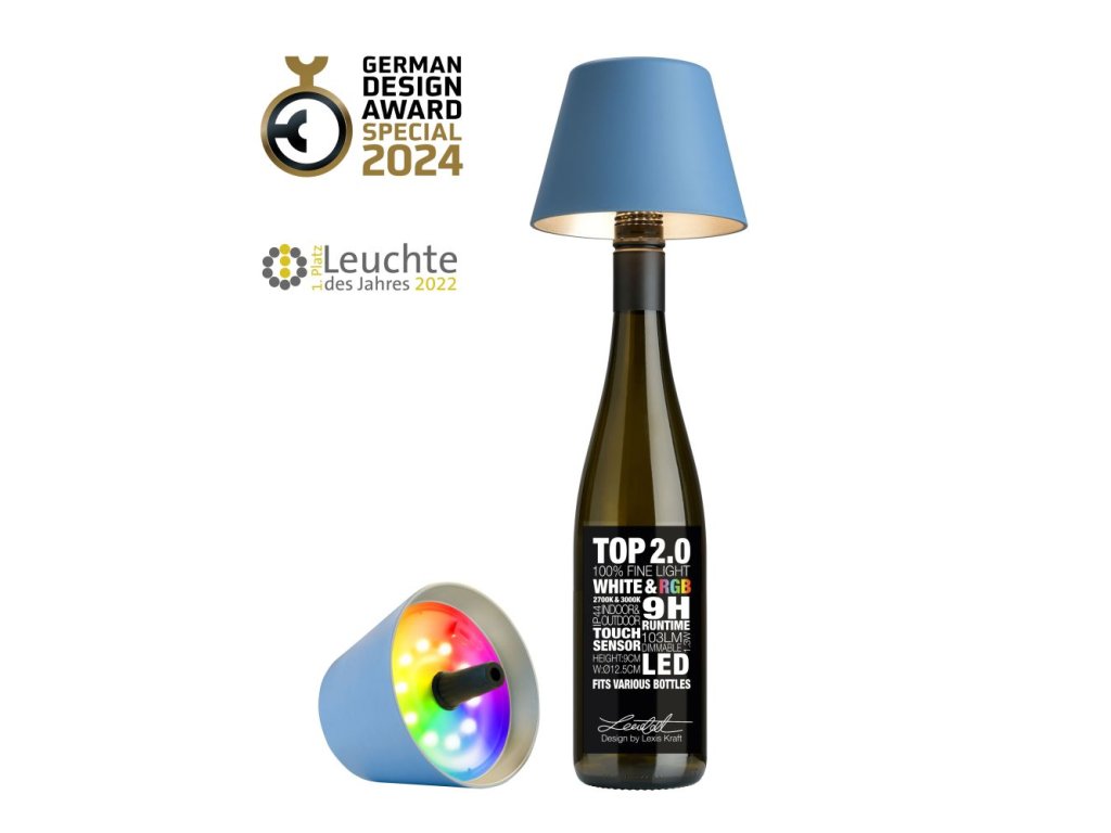 Stmievateľná lampička do fľaše na batériu Top 2.0 vo farbe: modrá s priloženou nabíjacou stanicou od nemeckého výrobcu Sompex.