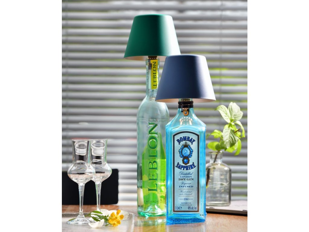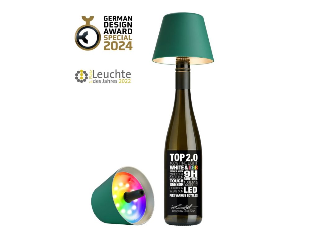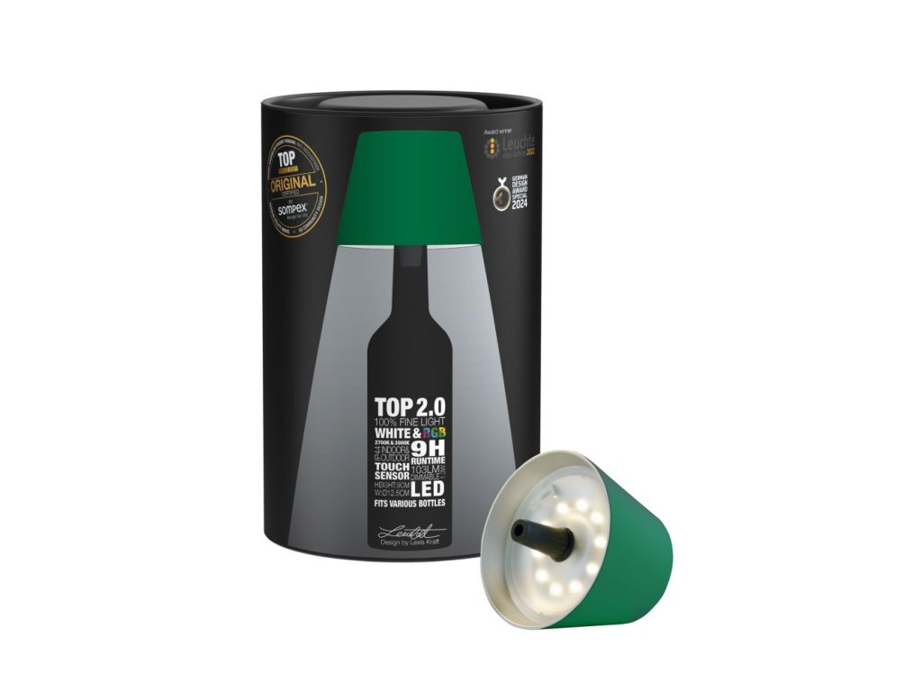 Stmievateľná lampička do fľaše na batériu Top 2.0 vo farbe: zelená s priloženou nabíjacou stanicou od nemeckého výrobcu Sompex.