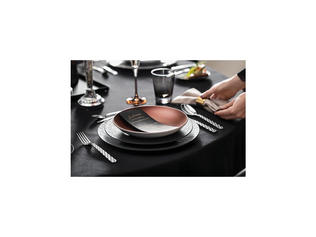 Štýlová a unikátna: ručne maľovaná kolekcia Manufacture Glow prináša inšpiráciu so svojou atraktívnou medenou farbou a jemným matným efektom. Skombinujte ju s kolekciou Manufacture Rock pripomínajúcou bridlicu a razom to dodá stolovaniu špeciálnu atmosféru a teplo.