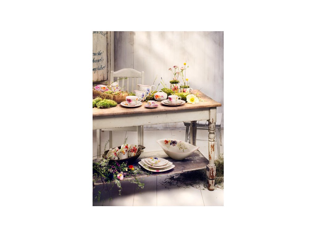 Hrejivé slnečné lúče dotýkajúce sa vašej tváre sprevádzané vôňou rozmanitých kvetov, ktoré sa jemne nákláňajú smerom k vám v ľahkom vánku - to je hravá a romantická kolekcia Mariefleur. Vzor zachytáva radostnú atmosféru vidieckej letnej záhrady a prináša ho priamo na váš stôl. Významný francúzsky maliar Claude Monet bol známy cyklami Lekná, ale stále sa snažil o rôzne tóny farebnosti kvetov a zachytiť ich prirodzenú krásu vo svojej veľkej záhrade v Giverny. Kolekcia Mariefleur vám tiež umožňuje vytvoriť kombinácie, ktoré spolu nádherne ladia. Rozdielne motívy vyzerajú, že vyrastajú mimo porcelánu.