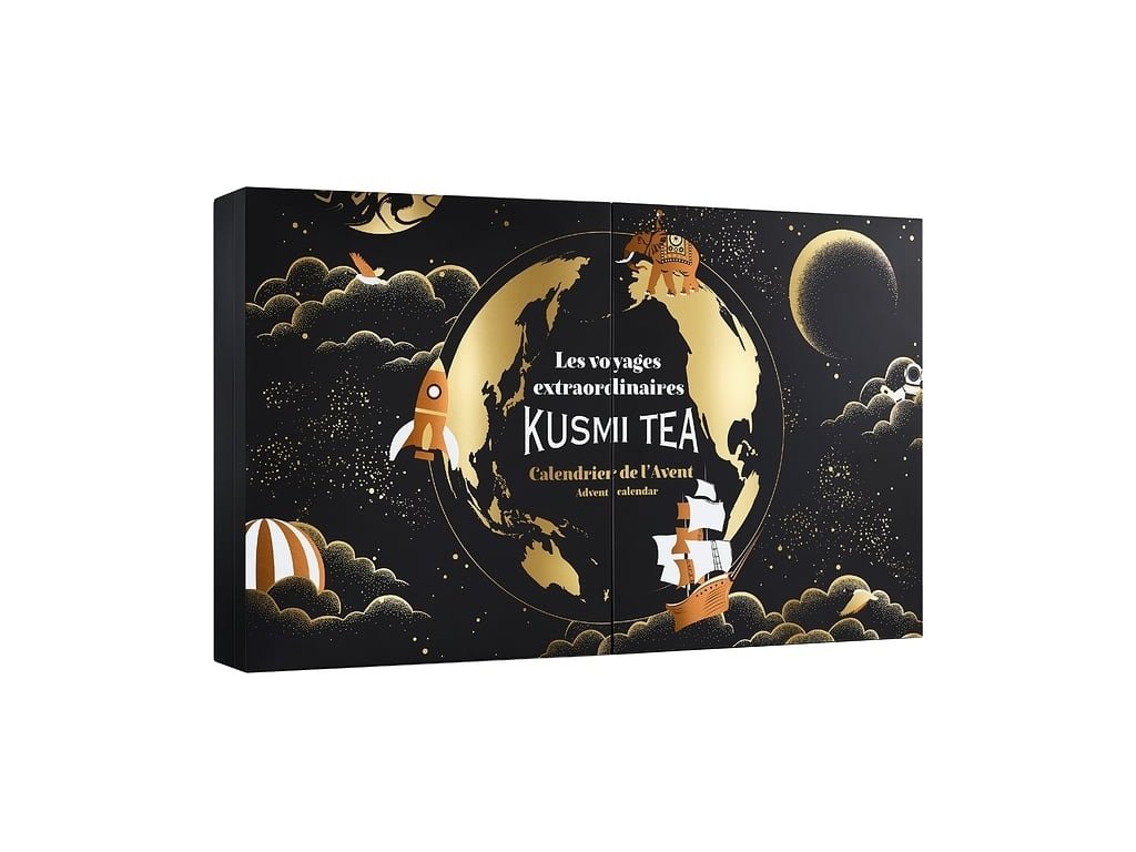 Papierový adventný kalendár na rok 2025 s 24 priehradkami v sebe skrýva lahodné čaje od francúzskeho výrobcu Kusmi Tea.