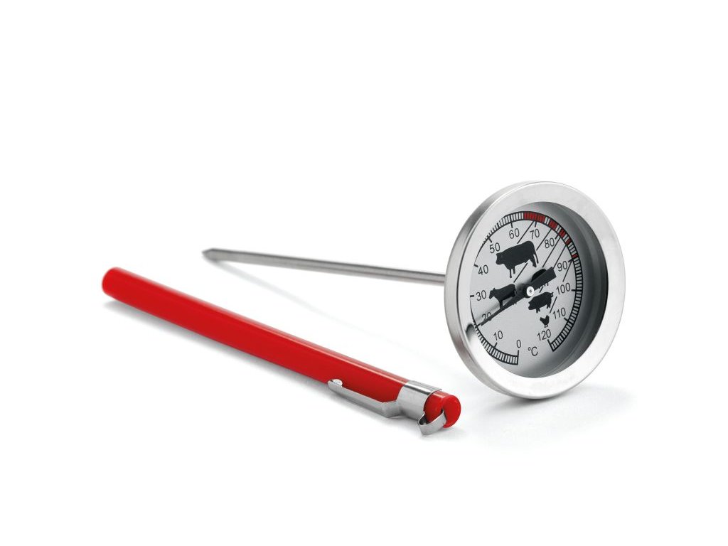 Praktický kuchynský teplomer na mäso meria teplotu až do 120 °C, je vyrobený z nehrdzavejúcej ocele od nemeckého výrobcu Weis.